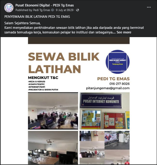 Promosi Penyewaan Bilik Latihan PEDi Tanjung Emas adalah untuk dikongsikan kepada komuniti setempat yang mahu membuat majlis atau program secara kecil-kecilan tetapi tiada tempat yang bersesuaian.